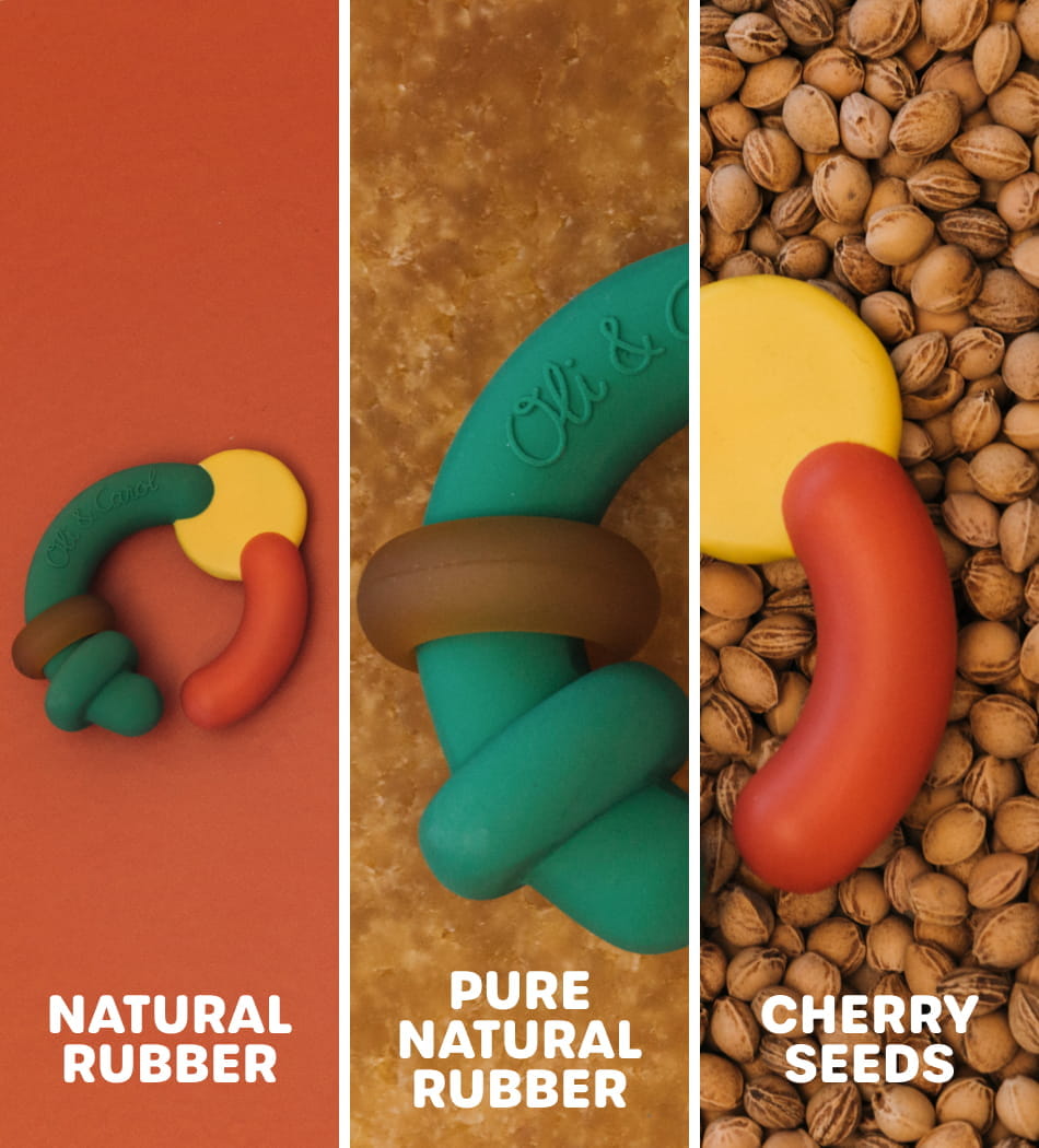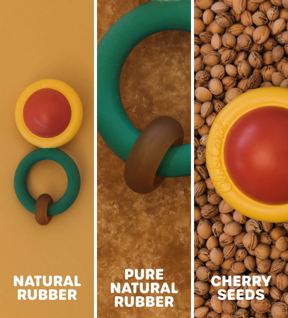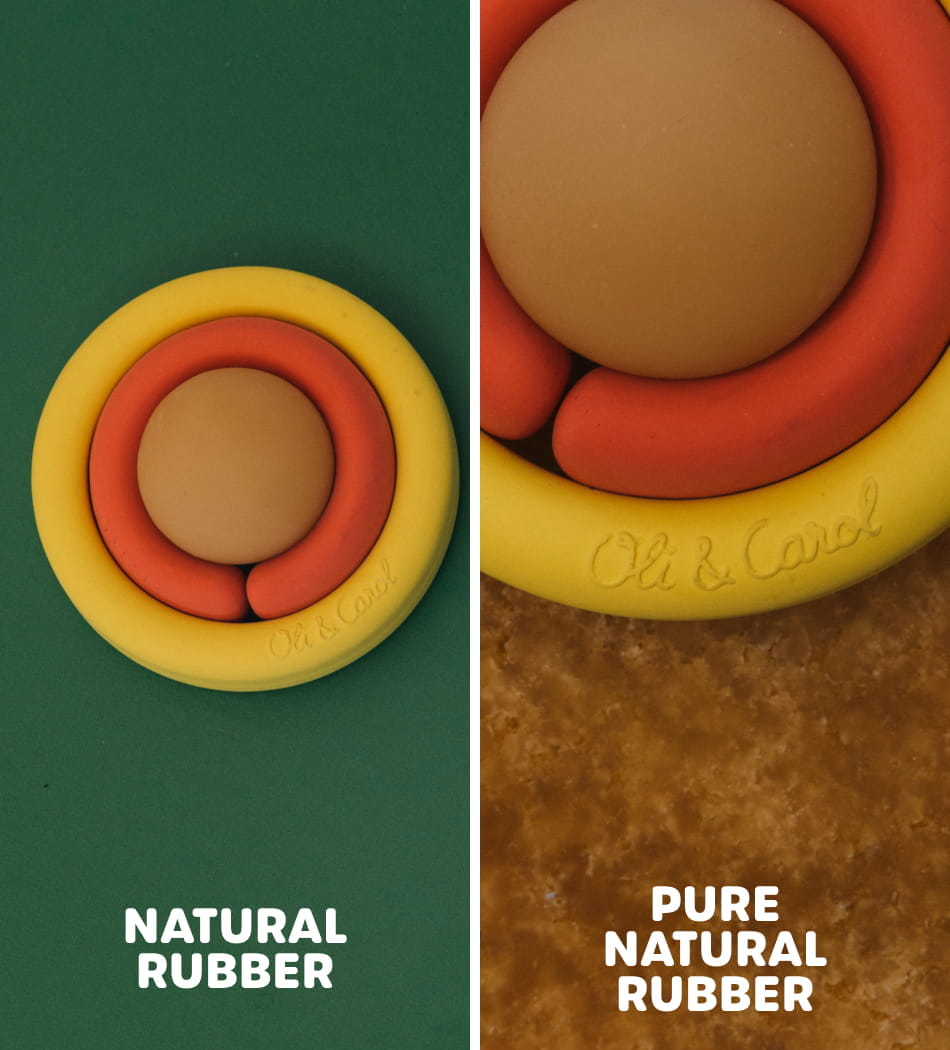 The toy is made from 100% natural rubber, while the central ball is crafted from Pure Natural Rubber, ensuring a safe, durable, and baby-friendly experience.