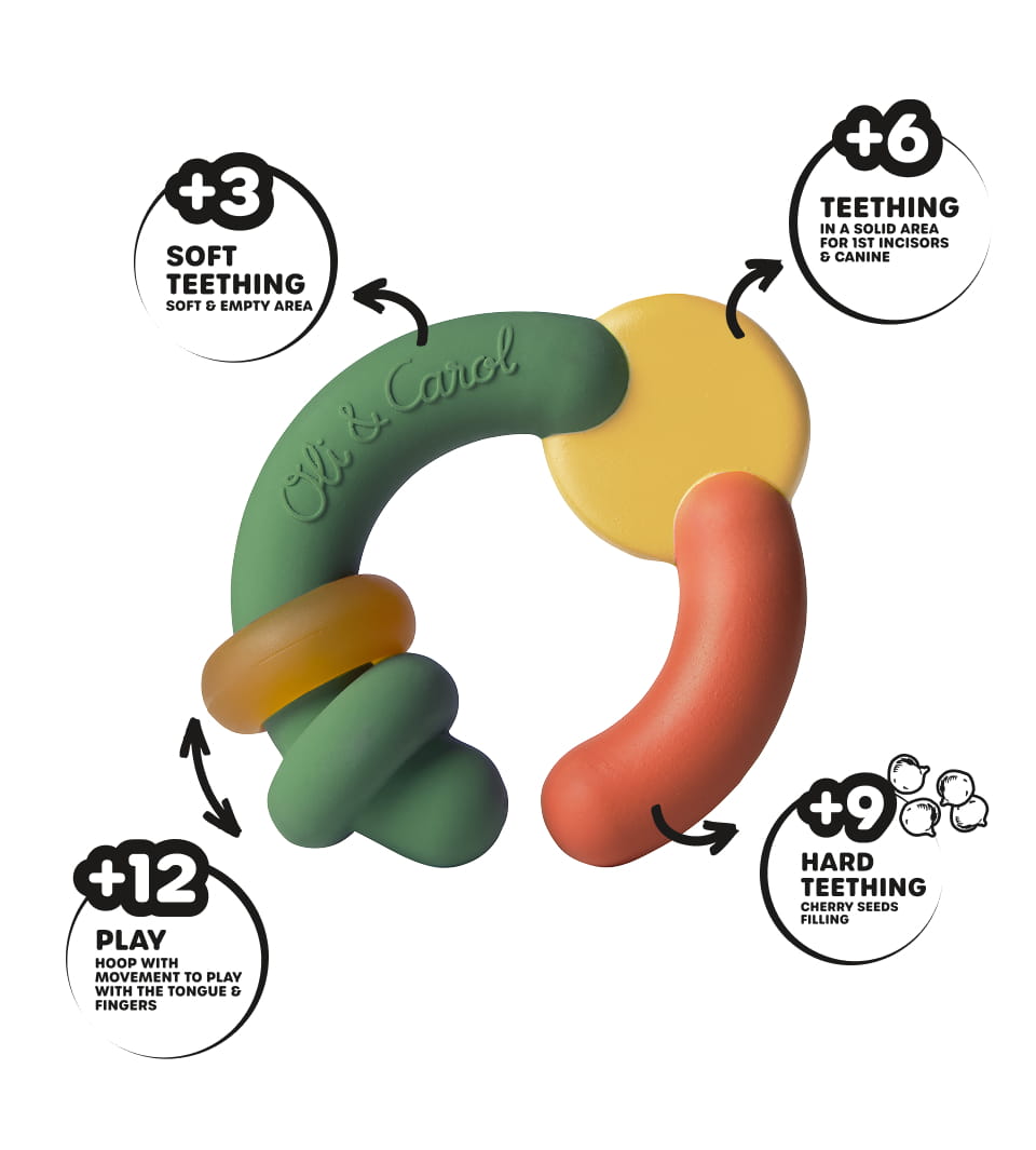 The teether features multiple shapes and textures, thoughtfully created to support babies as their teething needs evolve. Each part responds to a different moment of the teething journey — helping soothe gums, stimulate sensory exploration and encourage safe chewing.