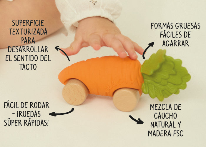 Los Green Cars de OLI&CAROL son una colección de coches de juguete para bebé con formas de frutas y verduras. Estos compañeros de juego imaginativo promueven una experiencia de juego sostenible y segura. Cada uno es único, pintados a mano con pigmentos naturales y fabricados con un 100% de caucho natural y y madera certificada FS, libre de plásticos o siliconas.