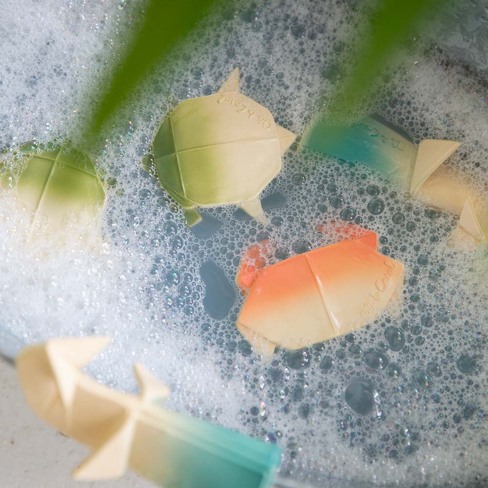 Suivant les designs inspirés de l'art de l'origami, déjà utilisé dans le jouet de bain Origami Boat, Oli&Carol crée trois créatures que l'on trouve dans nos océans.