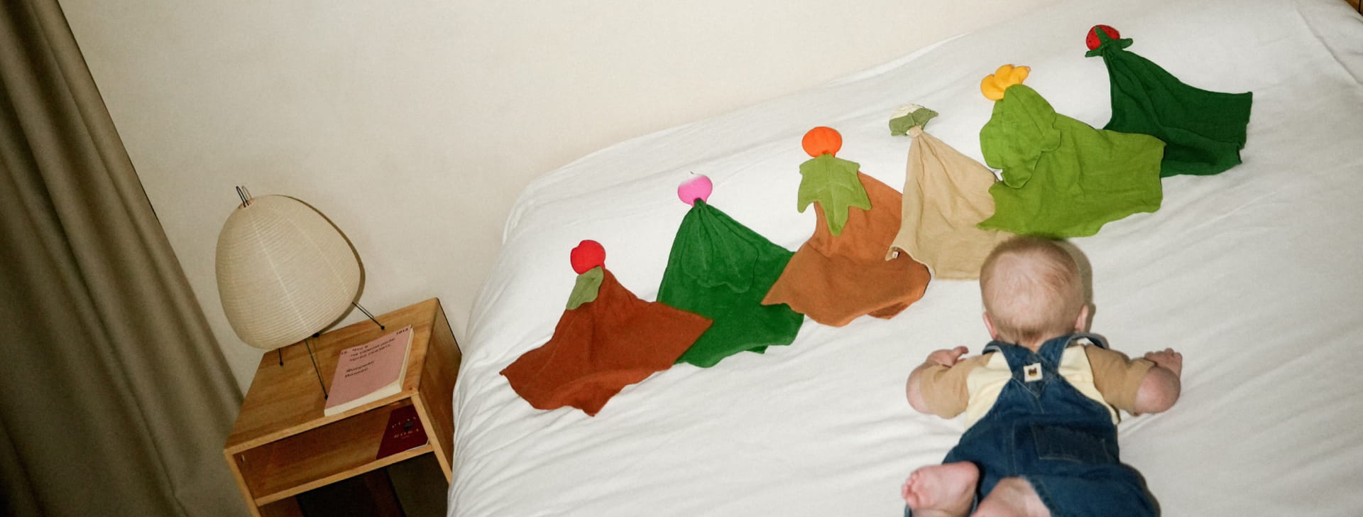 Le nostre iconiche frutte e verdure si trasformano ora in un big & mini doudou massaggiagengive con cotone certificato OEKO-TEX®.