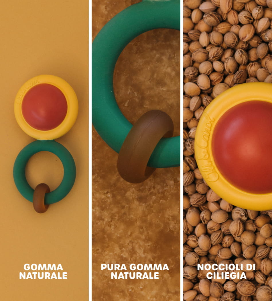 Il sonaglino è realizzato in 100% gomma naturale, garantendo morbidezza, sicurezza e protezione per il bambino.
