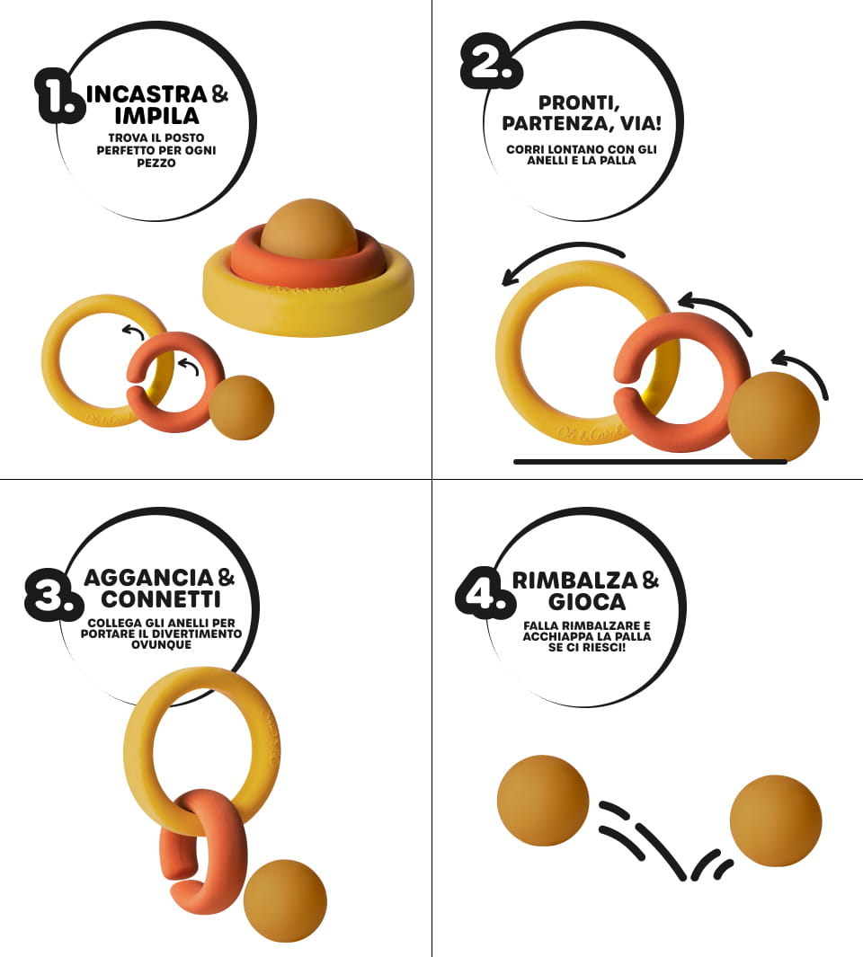 Il gioco è realizzato in 100% gomma naturale, mentre la pallina centrale è in Pura Gomma Naturale, garantendo un'esperienza sicura, durevole e adatta ai bambini.
