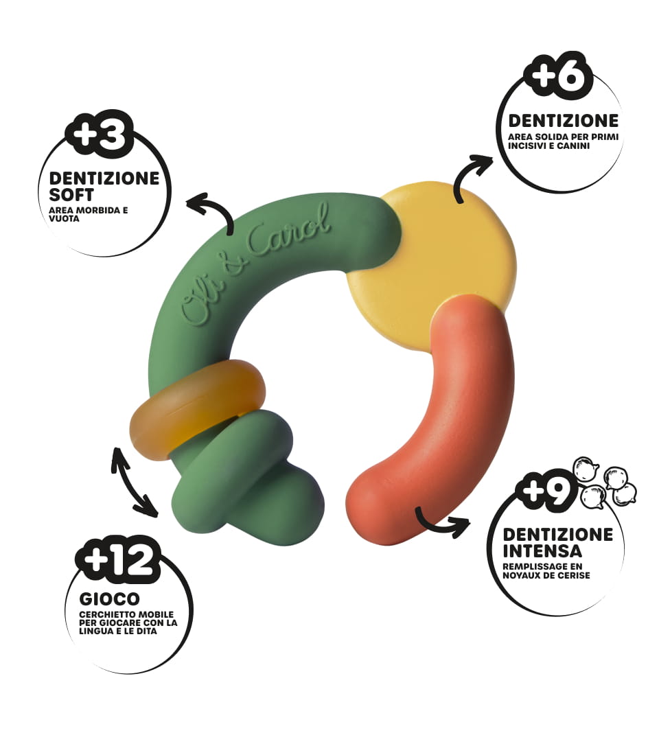 Il massettagengive presenta molteplici forme e texture, create con cura per supportare i bambini durante l'evoluzione delle loro esigenze di dentizione. Ogni parte risponde a un momento diverso di questo percorso: aiutando a lenire le gengive, stimolando l'esplorazione sensoriale e incoraggiando una masticazione sicura.
